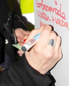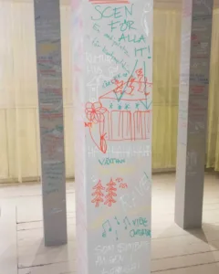 Responsen var överväldigande. Under kvällen fylldes rummet av besökare som tog sig an installationen med både nyfikenhet och engagemang. De fyra betongpelarna, uppförda i skala 1:4, blev snabbt bärare av hundratals röster.