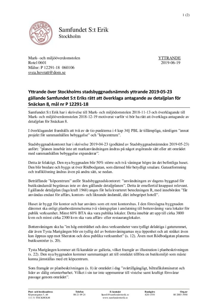 Snäckan 8, Mark- och miljööverdomstolen gällande Samfundet S:t Eriks rätt att överklaga antagande av detaljplan, mål nr P 12291-18, 20100619